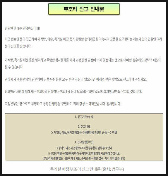 교도소에 들어간 재소자들은 서로 독방에 가기를 원하는데 왜냐하면 혼거실에 있으면 24시간 재소자끼리 같이 있고 스트레스 받으니까 차라리 혼자 있고 싶다면서 독방에 보내달라 단식을 한다거나 일부러 정신나간 행동을 하는데 현실은 잘 안 보내줍니다. 재소자들 사이에서 독방에 들어가는건 특권으로 생각하기 때문에 불필요한 차별 논란이 생길 수 있으며 교도관도 "저 새끼 일부러 독방에 들어갈려고 잔머리 굴리네" 생각하기 때문에 어지간하면 들어가기 쉽지 않습니다. 2019년에는 변호사가 접근해서 1천만원 이상 로비해서 재소자가 독거실에 가려는 비리, 편법이 걸려서 9시 뉴스에 뜨고 논란되자 교정본부가 신고 안내문도 배포하고 해당 변호사는 유죄 판결 나왔습니다.